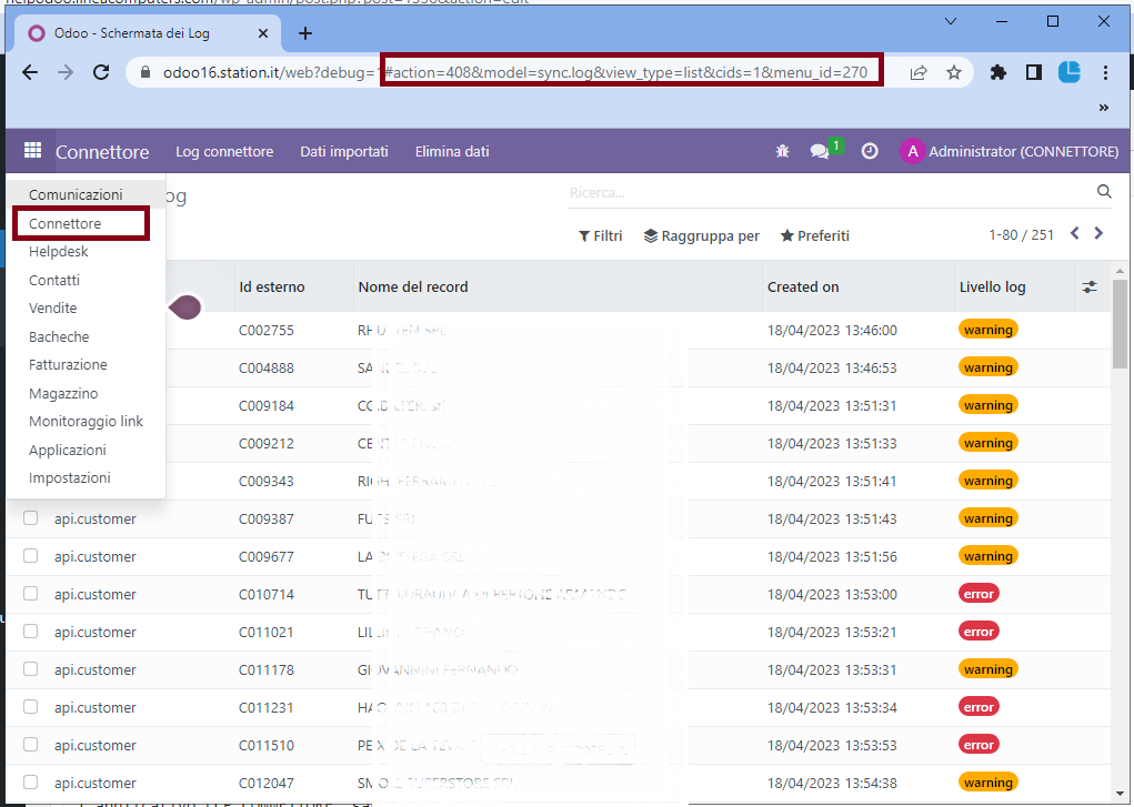 Andare su odoo, sul modulo Connettore, copiare il link nella barra degli indirizzi partendo da #action…..