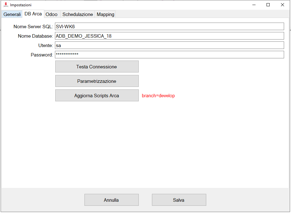Nelle impostazioni sarà possibile selezionare il db e agganciare i parametri di configurazione del database di ArcaEvolution e di ODOO.