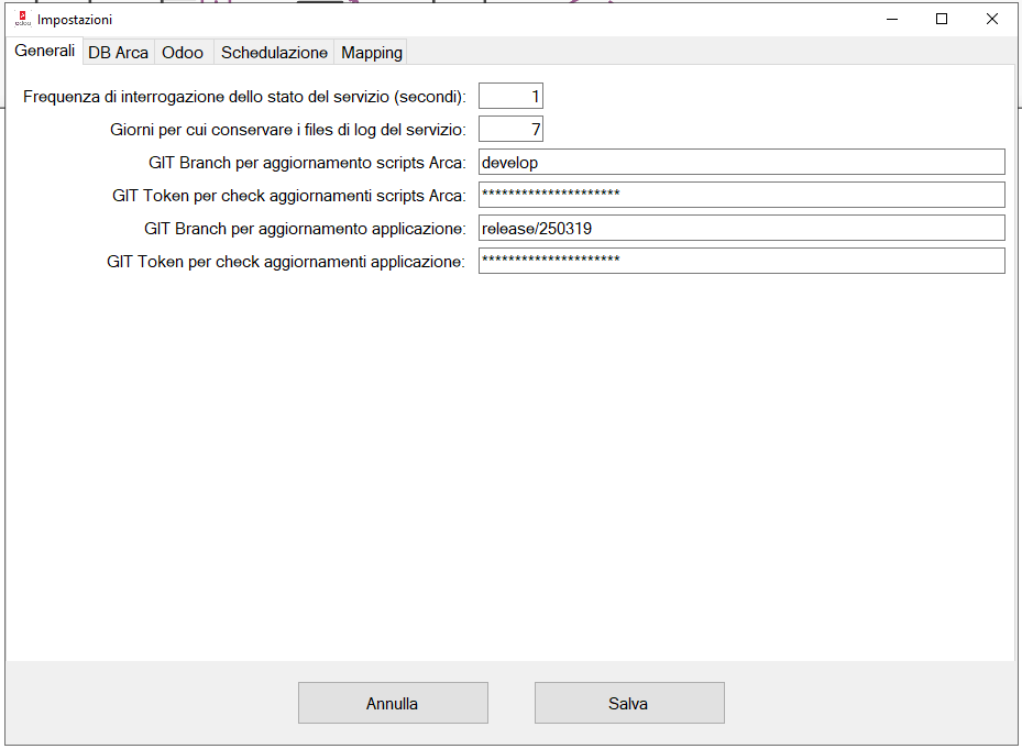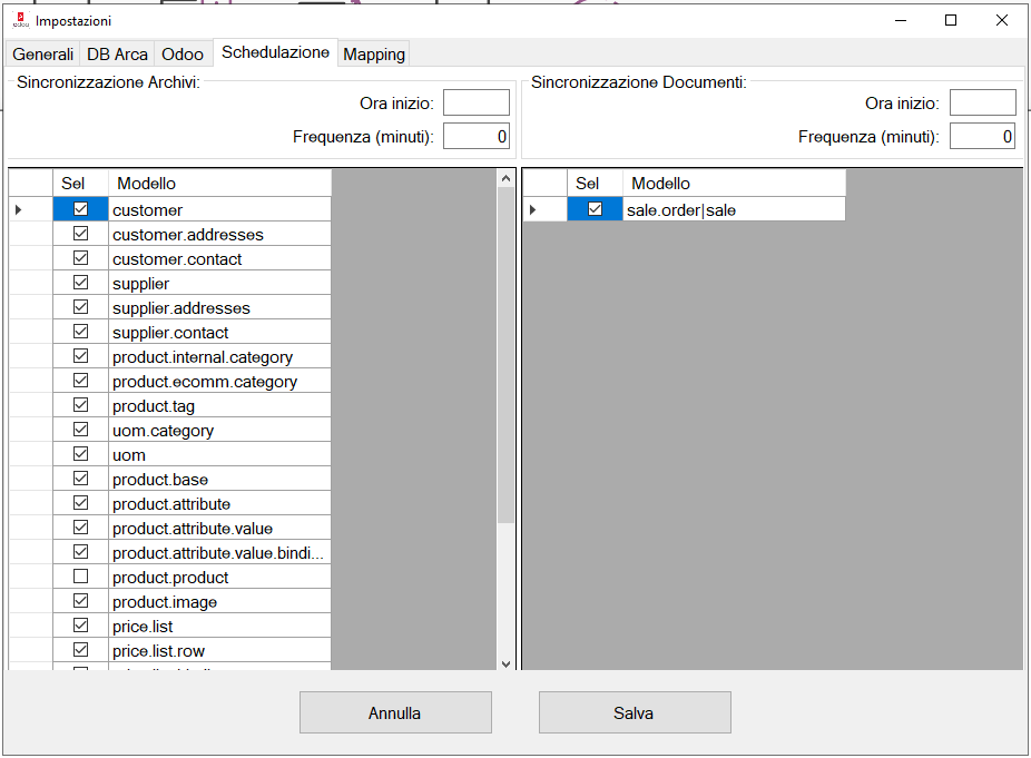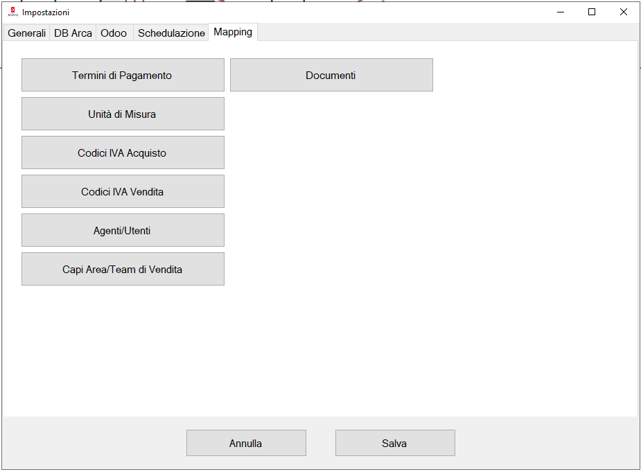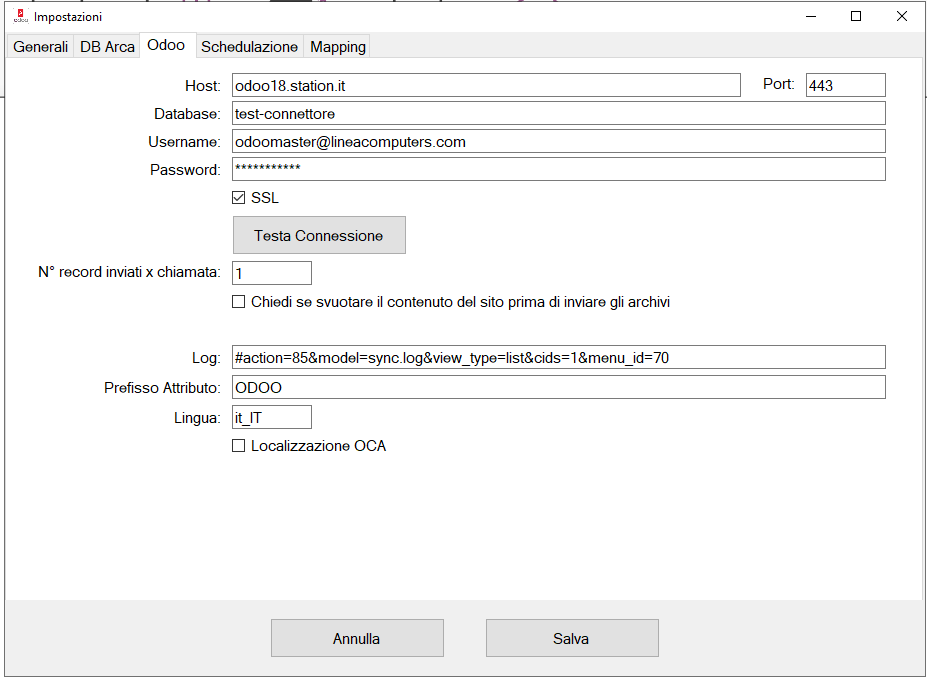 Qui verranno impostati i dati di mappatura necessari tra Arca e Odoo.