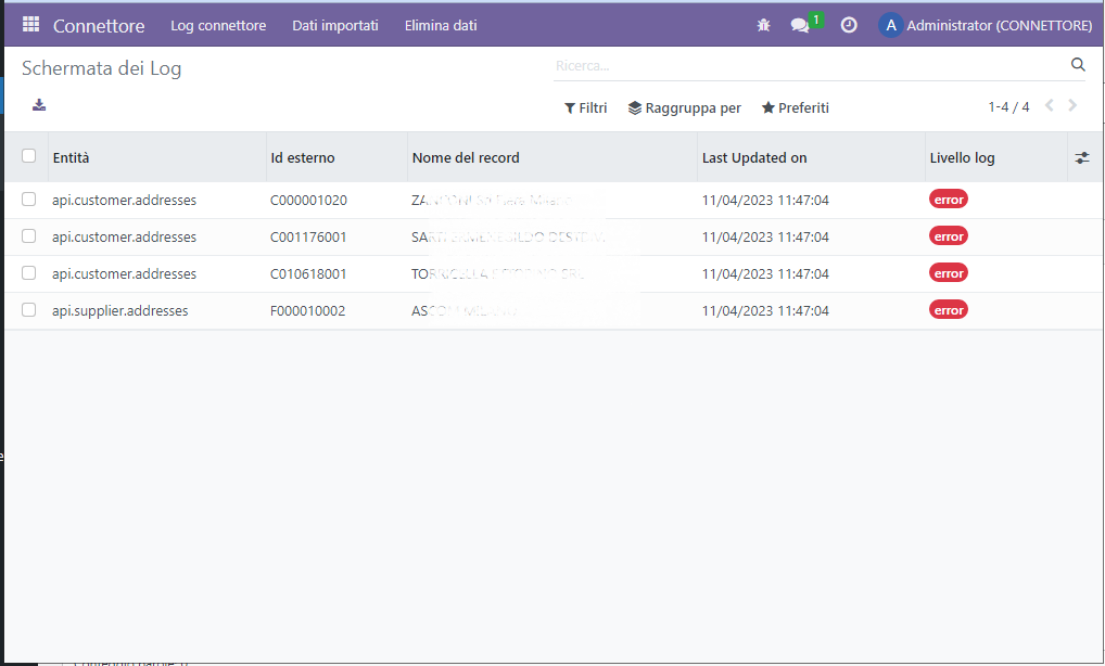 In questa sezione sarà possibile visualizzare gli errori di Log in fase di ricezione dati dal gestionale.