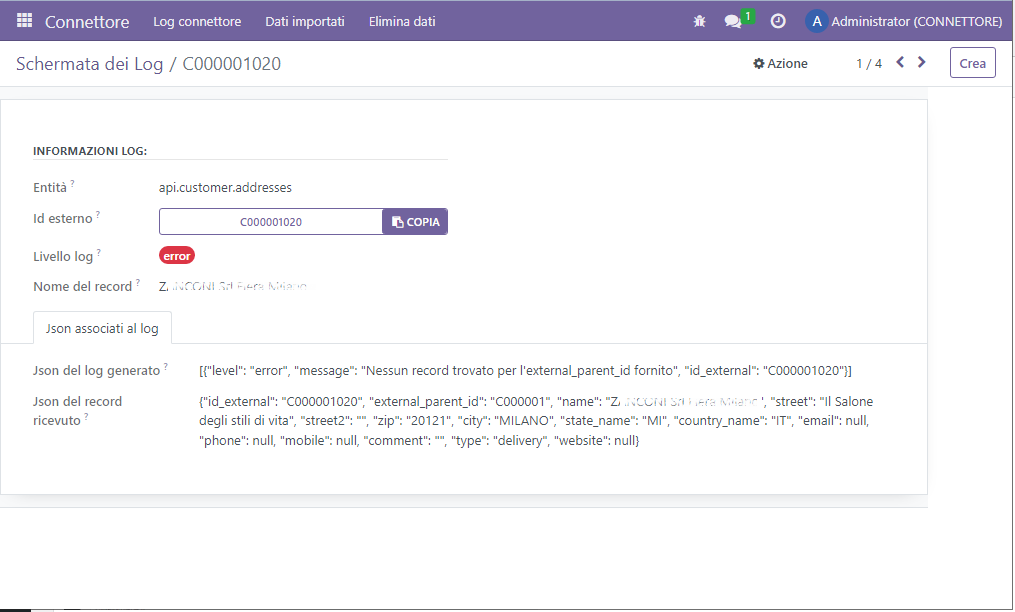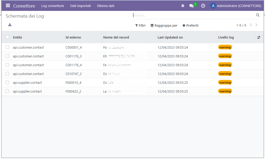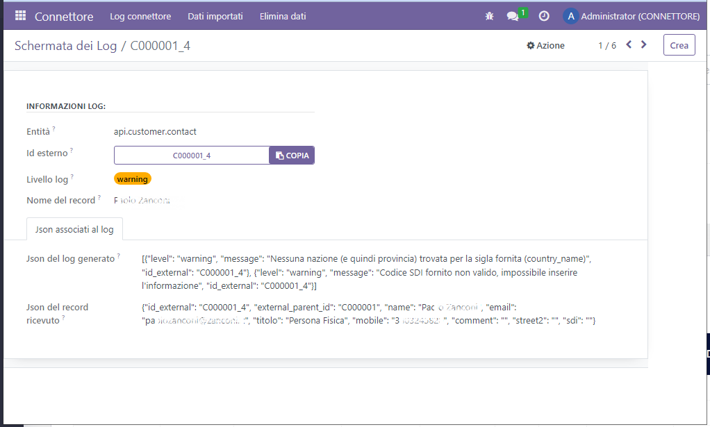 - WARNING: Segnalazione, il dato entra lo stesso sul databse di Odoo ma segnala l’anomalia che riscontra.