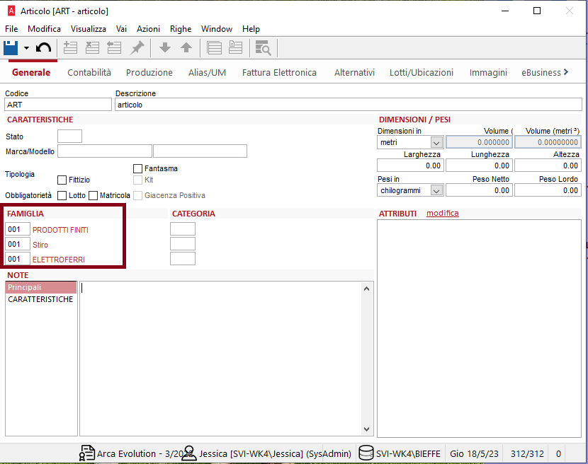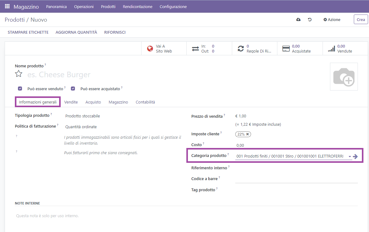 Le categorie interne fanno riferimento alle categorie già presenti in arca come Famiglia/Gruppo/Sottogruppo e saranno visualizzate su odoo nella scheda Informazioni Generali del prodotto.