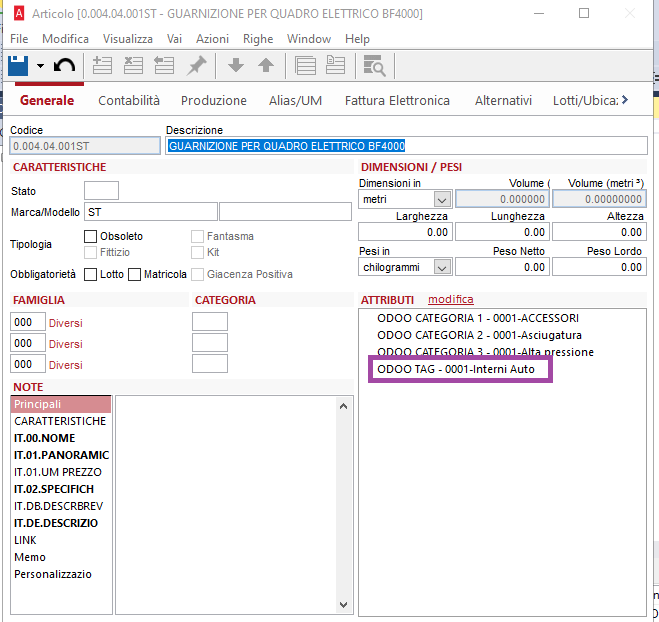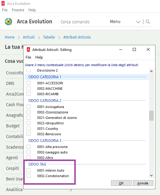 Per categorizzare i nostri prodotti che derivano da Arca, dovremo creare i tag come Attributi articolo.