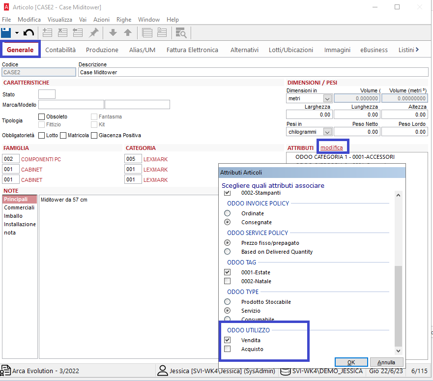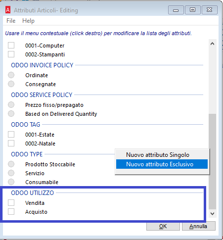 Per determinare che tipo di utilizzo avrà il prodotto su odoo, sarà necessario creare un attributo su Arca.