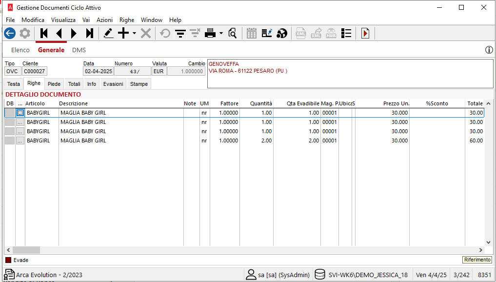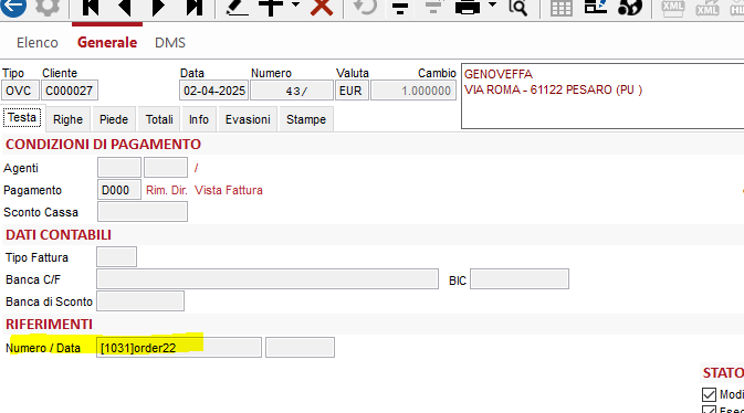 Il documento entrerà correttamente in ARca con i riferimenti di odoo sulla testata documento: